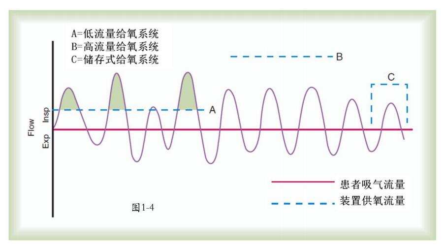 (2)高流量給氧系統(tǒng)(圖 1-4,B)總是超過患者的流量并提供固定的?FiO2。