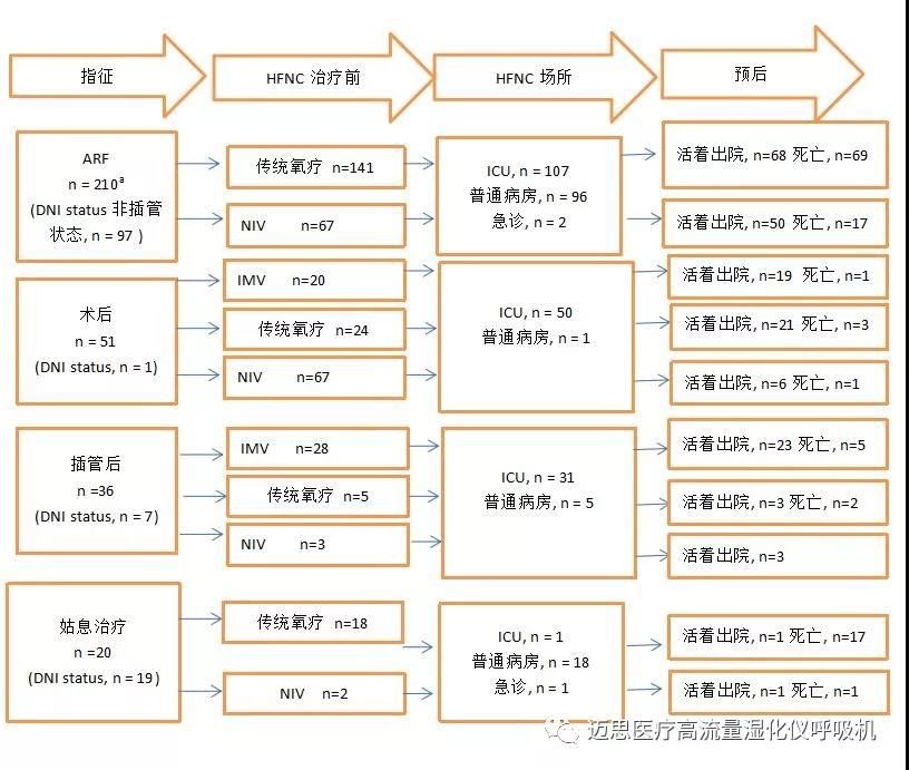 圖1. HFNC的臨床適應(yīng)癥,HFNC治療前,應(yīng)用場所和生存預(yù)后的流程圖。在HFNC使用之前,兩名未接受呼吸支持的患者和一名接受家庭NIV的患者不包括在流程圖中。